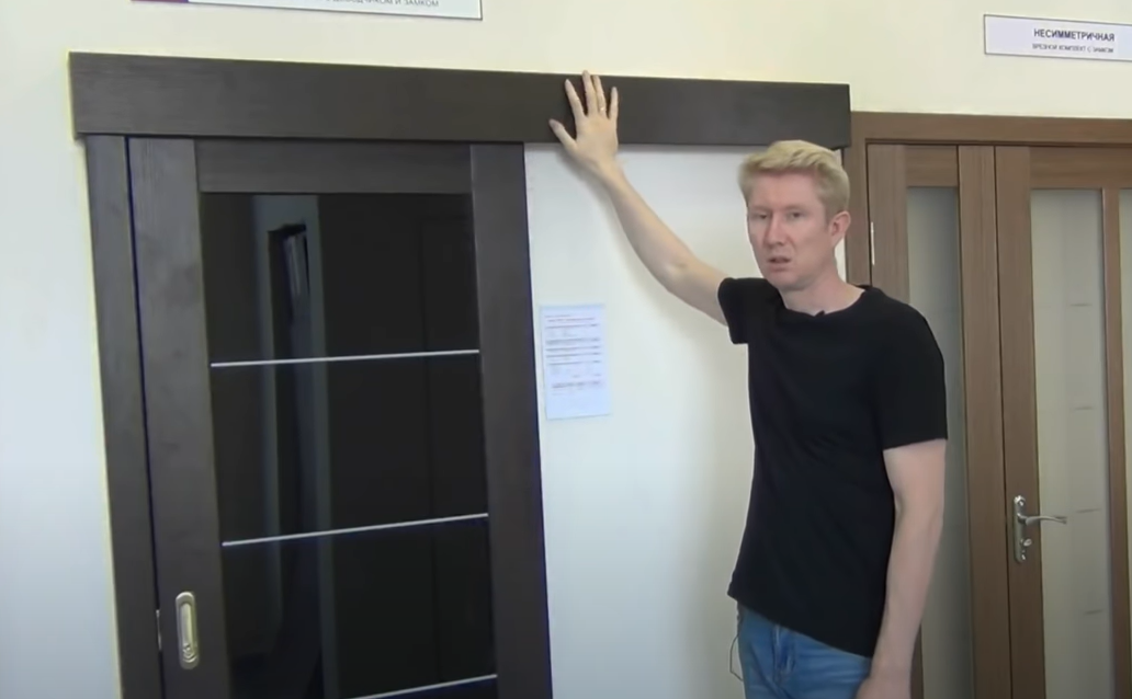 Всё дело в том, что дверное полотно вешается от стены на расстояние 2-3 миллиметра и при смещении всегда находится на этом расстоянии. Если на пути движения дверного полотна окажется какой-то выступающий элемент, то двери просто упрутся в этот элемент. Дверное полотно шире дверного полотна должно быть минимум на 2-3 сантиметра, в идеале это должно быть 5-8 сантиметров. Теперь давайте поговорим о комплектации двери-купе.