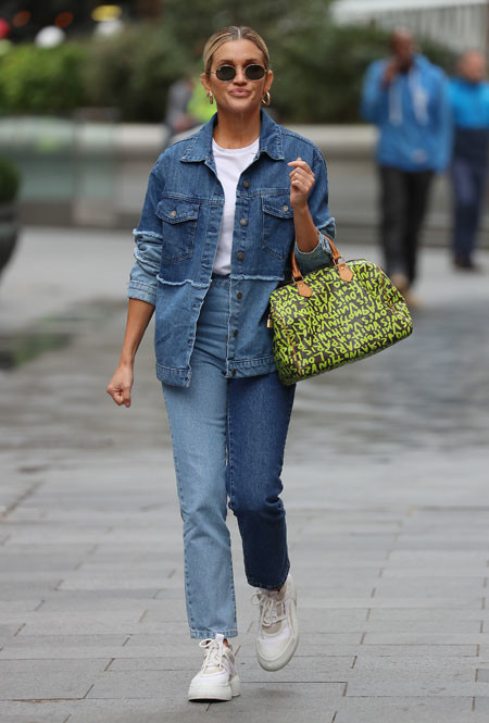 Телеведущая и певица не перестает вдохновлять нас на разнообразные повседневные образы. Несмотря на любовь к ярким и необычным аутфитам, нередко она составляет наряды из базовых вещей, которые точно есть в гардеробах многих. Например, джинсы с курткой из денима и лаконичной футболкой, как в одном из последних образов. Правда, без аксессуаров этот наряд выглядел бы чересчур скучно, поэтому Робертс