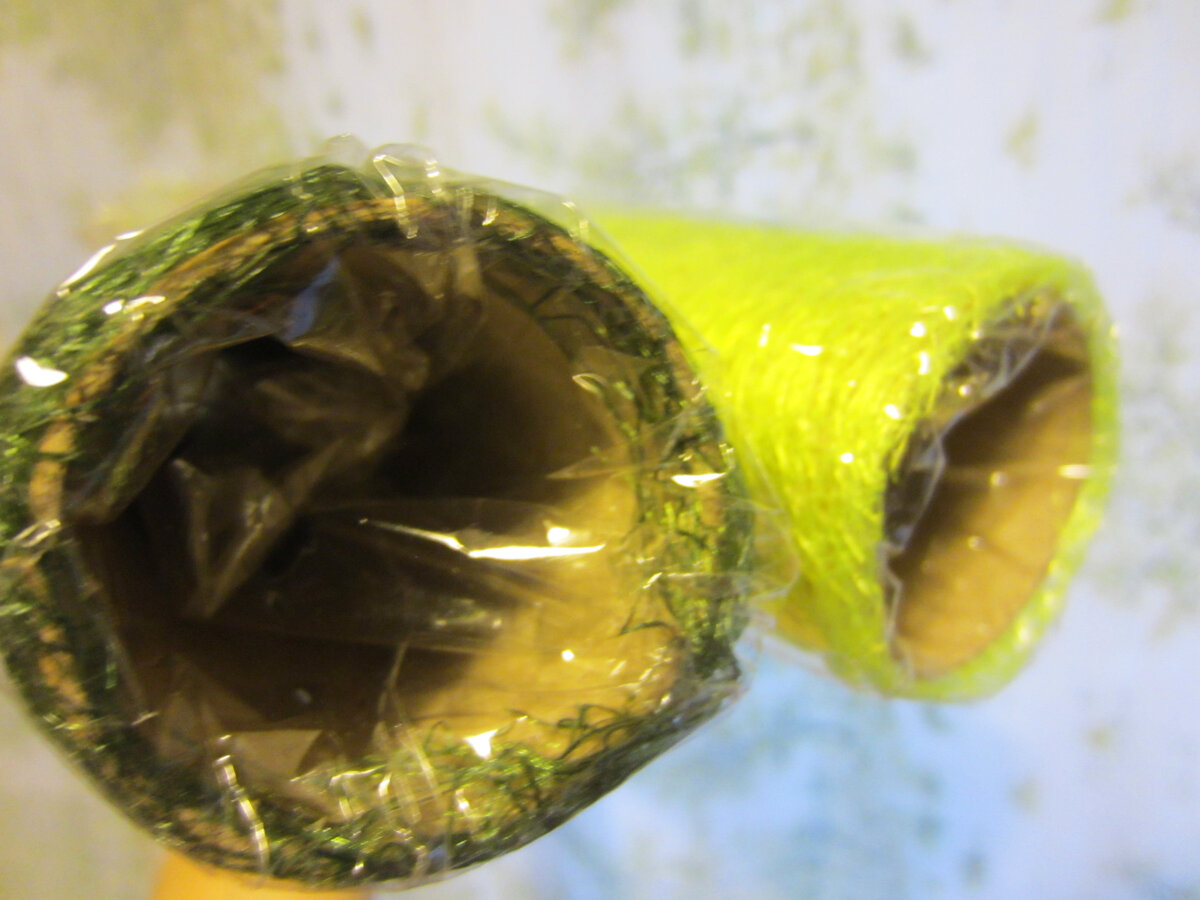 Если нужно было бы действительно упаковать эти два предмета, я бы отрезала ножницами кусок нужной длины, собрала бы сверху. И закрепила бы проволокой, резинкой, декоративной лентой или ещё чем-нибудь.