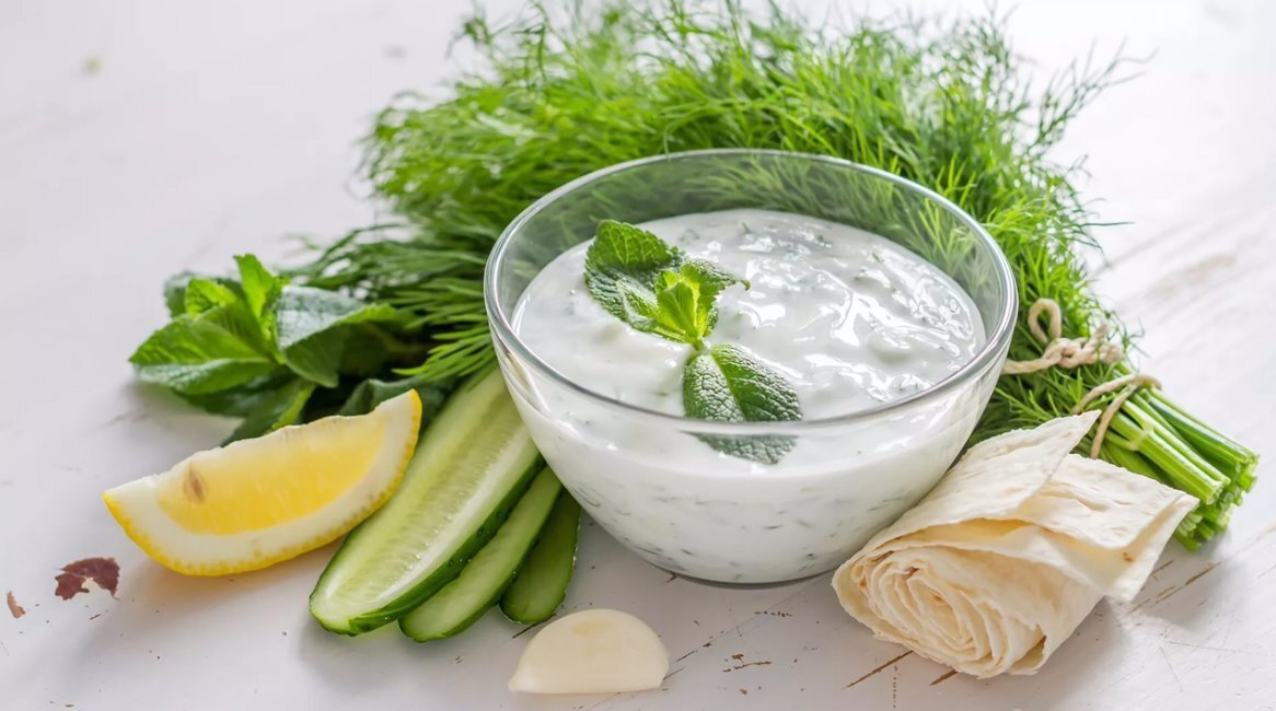 2.) Берём ёмкость, вливаем туда йогурт и добавляем овощи с зеленью, солим и перчим. Берём миксер/блендер и взбиваем 1 минуту.