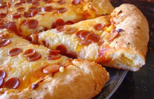 Если у вас есть немного кефира или прокисшего молока, то, как вариант, можно приготовить тесто и испечь вкусную пиццу. Остальные ингредиенты для начинки у вас точно найдутся на кухне.