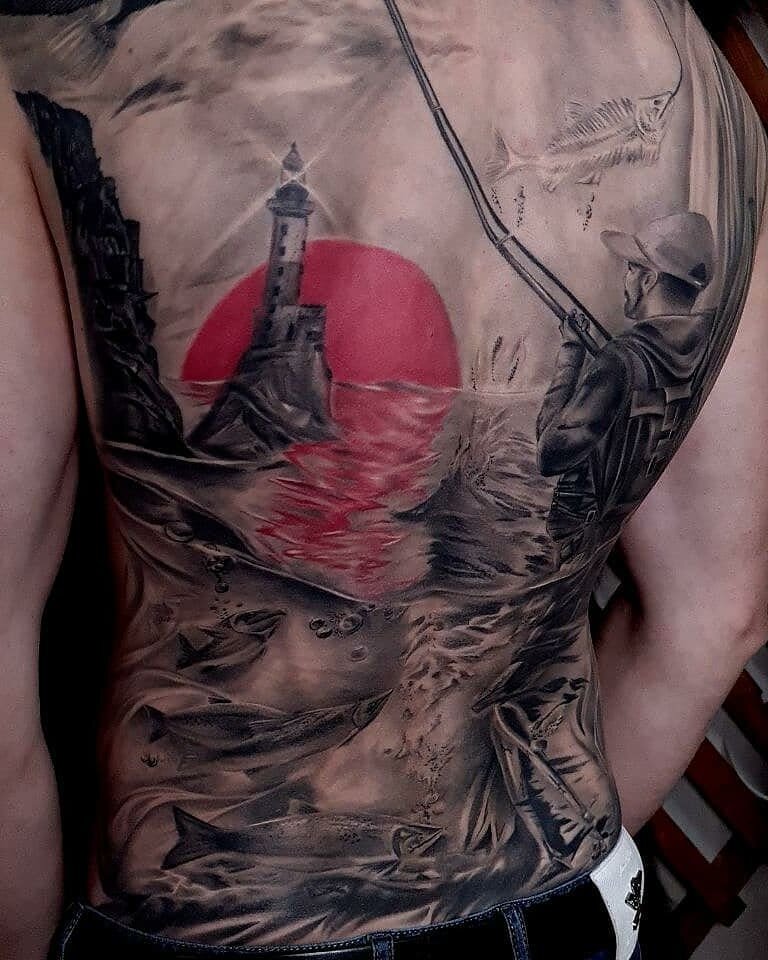 Мужчина около 45 часов, наполненных болью и шумом машинки, пробыл в тату-салоне Южно-Сахалинска, чтобы забить разноцветным изображением всю спину. Эскиз подобрали запоминающийся — на фоне маяка Анива он, вооружившись удочкой, встречал закат.