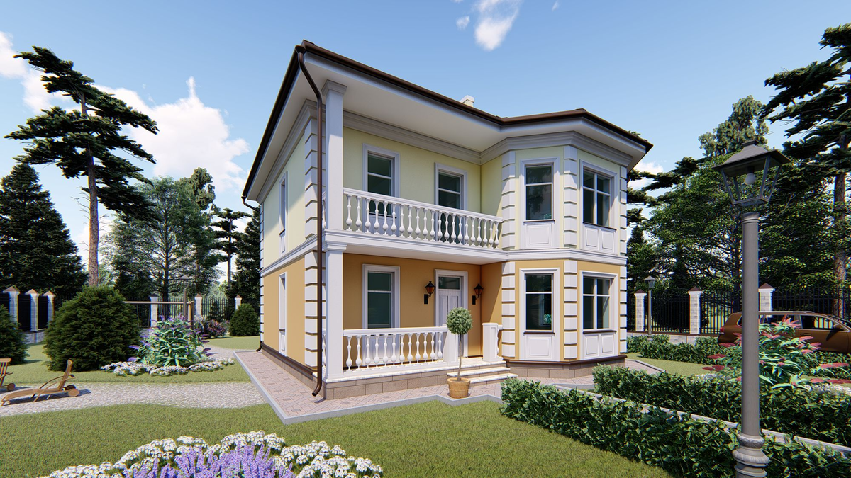 Достойный проект двухэтажного загородного дома из газобетона в классическом стиле для проживания и отдыха семьи из 2-3 поколений. Высокие потолки и большие окна увеличивают пространство помещений и наполняют светом. В отделке фасадов много декоративных элементов, ограждение балконов и террас поручнями с массивными балясинами.