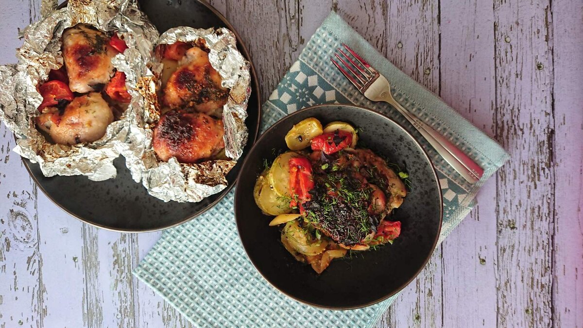 Для заправки смешать все ингредиенты. На фольгу выложить овощи, посолить и поперчить. На овощи положить бедра, посолить и поперчить с обеих сторон. Сверху налить заправку и посыпать зеленью.