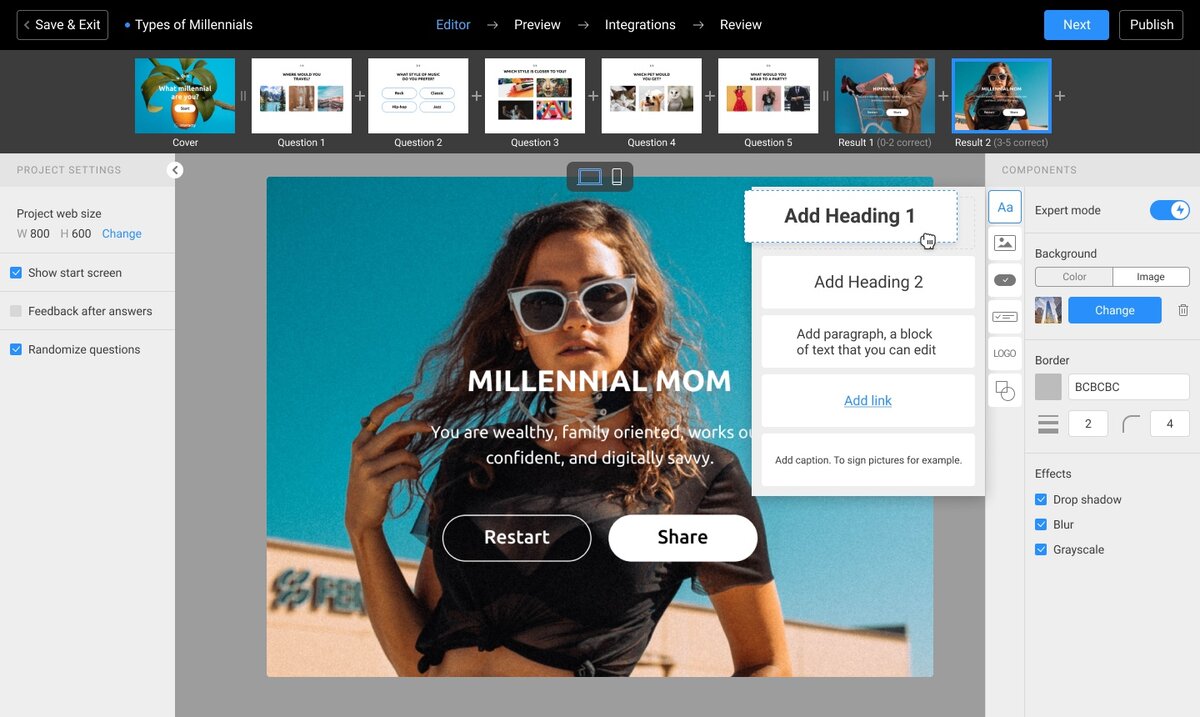 Interacty.me предлагает один из самых продвинутых редакторов интерактивного контента – попробуйте сами: режим «Эксперт» позволяет перетаскивать элементы из библиотеки прямо в ваш проект. Добавляйте кнопки, картинки, варианты ответов, логотипы, тексты – все это в произвольном порядке. Теперь только вы решаете, каким будет дизайн вашего проекта. У вас строгое издание – выберите подходящие шрифты и монохромные кнопки. Яркий лайфстайл-журнал? Используйте яркие цвета и необычные дизайнерские решения! А главное, все возможности редактора доступны для всех пользователей, в том числе и на бесплатном тарифе :)