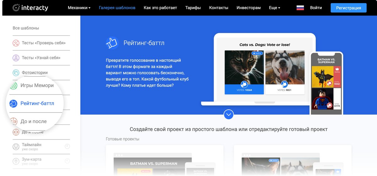Свой баттл можно сделать всего за несколько минут с помощью универсального конструктора интерактивного контента Interacty. Для этого откройте галерею шаблонов и выберите механику «Рейтинг-баттл».