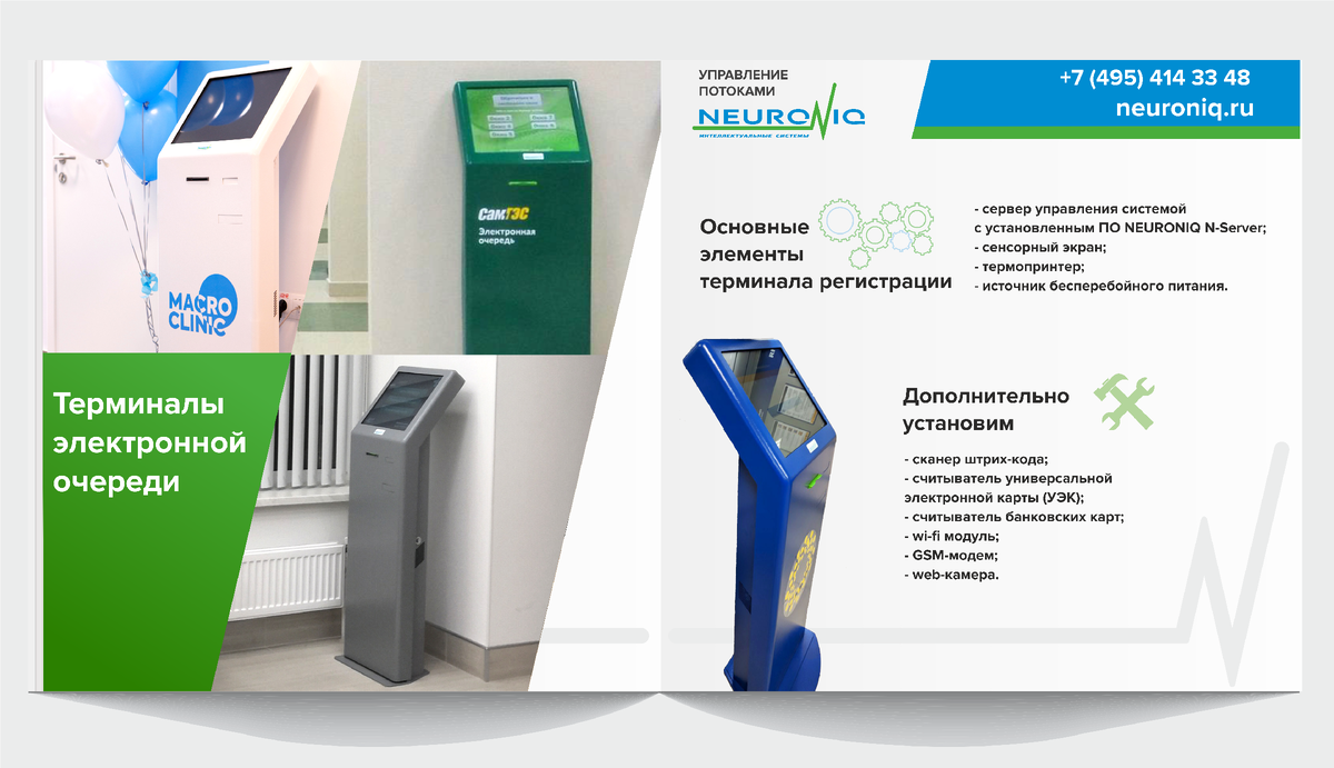1) Киоск электронной очереди встречает на входе всех посетителей, с него начинается обслуживание. Существует большой выбор терминалов выдачи талонов, которые выполняются в фирменных цветах и с нанесением логотипа, возможно напольное, настенное и уличное исполнение.