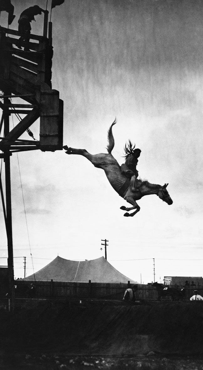 Именно в те времена, пытаясь удивить публику, придумали новое развлечение. Одна девушка впервые прыгнула в бассейн с вышки, крепко держась за спину коня. Этот поступок выглядел сумасшедшим, диким и невероятно отважным. Высота трамплина все время увеличивалась, пока не достигла 15 метров. После первого прыжка Мэми поняла, что ее конь Змеевик не подходит для таких забав, и взяла на замену его мать арабской породы, которую ласково назвала «Малышка» (Babe).
