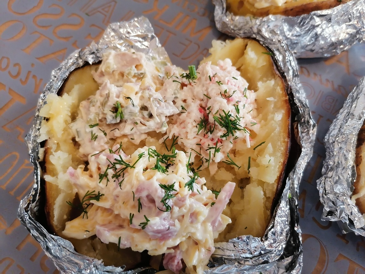 Картофель с наполнителями, блюдо простое и вкусное! Картофель обернуть в фольгу и в жарочном шкафу запекать при 200° до готовности. Пока картофель запекается, подготавливаем наполнители: крабовые палочки, лучше снежный краб ветчина и сыр курица, сыр, маринованные огурцы (не очень сочетается) Всё с майонезом В готовый картофель можете добавить, то что нам нравится: сыр укроп лук фри и т.п.