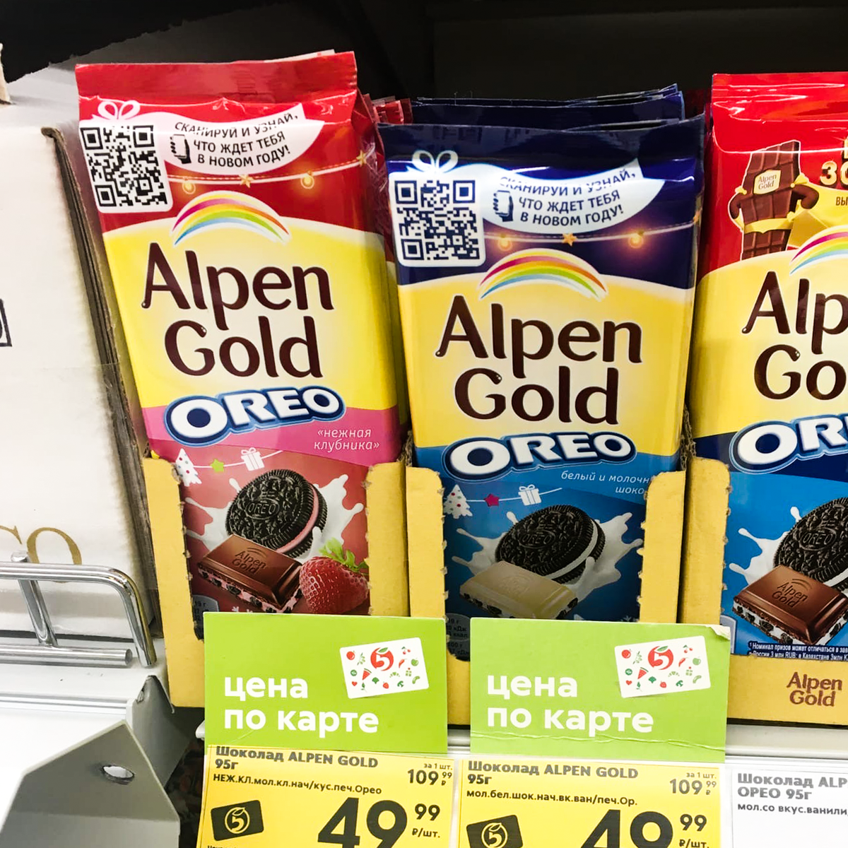 С сентября 2020 года в некоторых магазинах уже можно найти два новых вкуса в линейке шоколада Alpen Gold Oreo — «Нежная клубника» и «Белый и молочный шоколад».