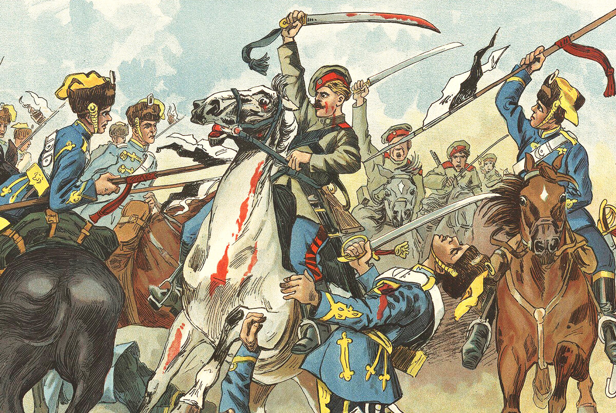 "Австрийская линия ... прорезанная красной линией чакчир, волнуюшаяся белыми султанами и голубыми развивающимися ментиками, блистая шлемами и касками ... в поразительном порядке и красоте показалась на гребне". Волны "Ура!" прокатились по всему фронту и вслед за тем смешались в глухом, протяжном, тяжелом ударе двух столкнувшихся живых масс. Первая шеренга австрийского строя на мгновенье замерла и как бы поднялась на воздух, нанизанная на русские пики. Раскатами барабанной дроби посыпались шашечные и сабельные удары, то глухие, то резкие, металлические в тех случаях, когда шашка встречала на своем пути железные каски ... обе стороны начали разстраиваться и смешиваться в общую массу"