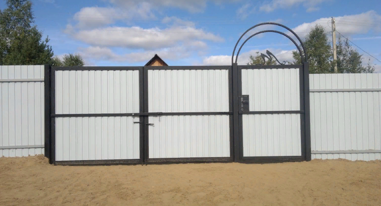 Далее приступил к реализации плана: купил профнастил С-10 уже нарезанный по размерам. Одновременно с этим заказал у профессионалов ворота с калиткой, так как я этим никогда не занимался. Ещё до доставки профнастила ворота были уже готовы — ставили их вдвоём с тестем.