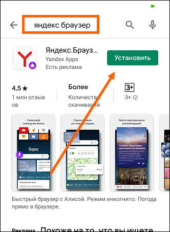 1. Заходим в Плей маркет или App Store, и забиваем в строку поиска «Яндекс браузер», после жмём кнопку «Установить».