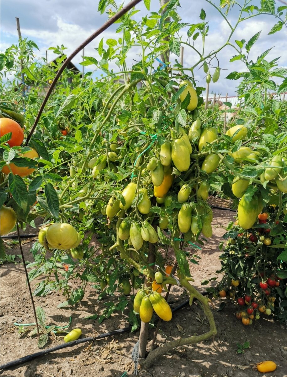 Это высокорослый томат. Формировала его в 5 стеблей, несмотря на это, плоды выросли крупными. Куст не сбросил ни одного цветка.