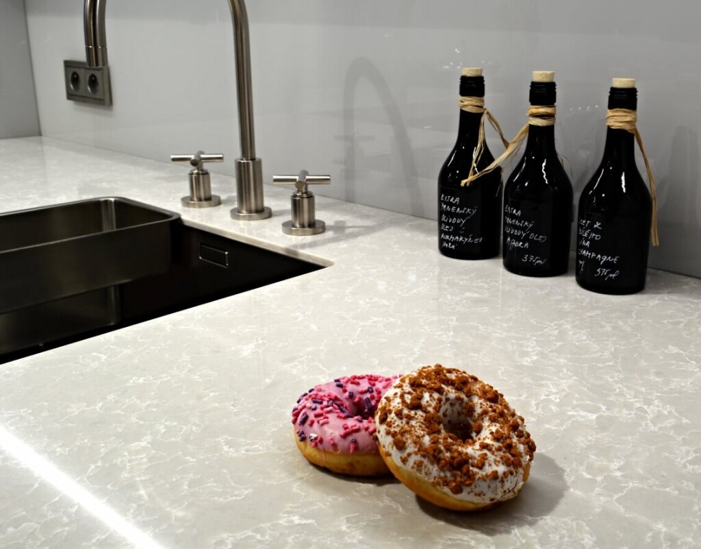 - Красота. Натуральный камень, кварцевый агломерат впишутся в любую композицию, которую предложит мебельный дизайнер. Каменные покрытия будут актуальными во все времена благодаря эстетичному, "богатому" внешнему виду.