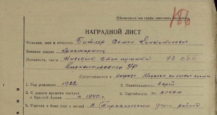 Семён Константинович Гитлер родился в городе Оринин (ныне Хмельницкая область) Украины в 1922 году, еврей по национальности. В 1941 ему было 19 лет. Тогда он 8 дней уничтожал противников пулеметом во время наступления стрелкового взвода. Был ранен, но огонь не прекратил, более того, ползком пробирался мимо рядов противника более 10 км, за что вскоре и был награжден. Героически погиб в боях за Севастополь 3 июля 1942.