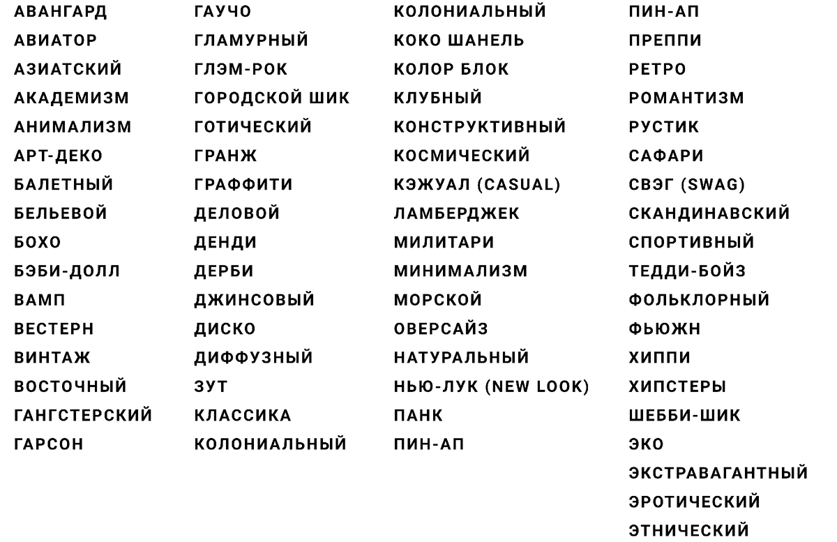 В прошлый раз я рассказывала про различные стили в одежде на букву А. Смотрите список ниже, в котором собраны все основные стили.