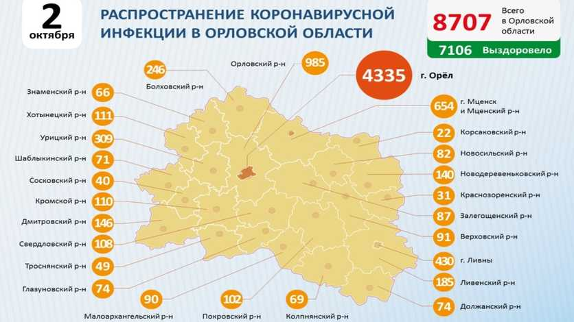 В Орловской области 2 октября стало известно о двух умерших пациентах с коронавирусом, а также о 65 новых заразившихся, сообщили в пресс-службе региональной администрации со ссылкой на федеральный оперативный штаб.