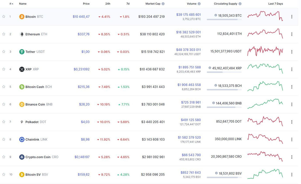 Все криптовалюты из топ-10 рейтинга капитализации ресурса CoinMarketCap завершают рабочую неделю падением. По состоянию на 12:51 (МСК), bitcoin торгуется по $10 440. За сутки актив потерял 4.41% стоимости. Больше всех за 24 часа пострадал токен Chainlink (-11.92%).