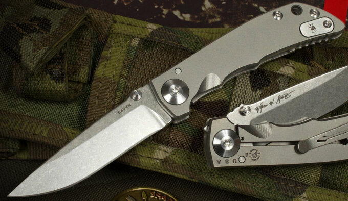 - симметричный 8,25 см клинок модифицированной формы Drop Point из CPM стали S45VN твёрдостью 59-61 единиц по шкале Роквелла со шлифованной камнями "галтованной" поверхностью, прошедшей «двойную криогенную обработку»,