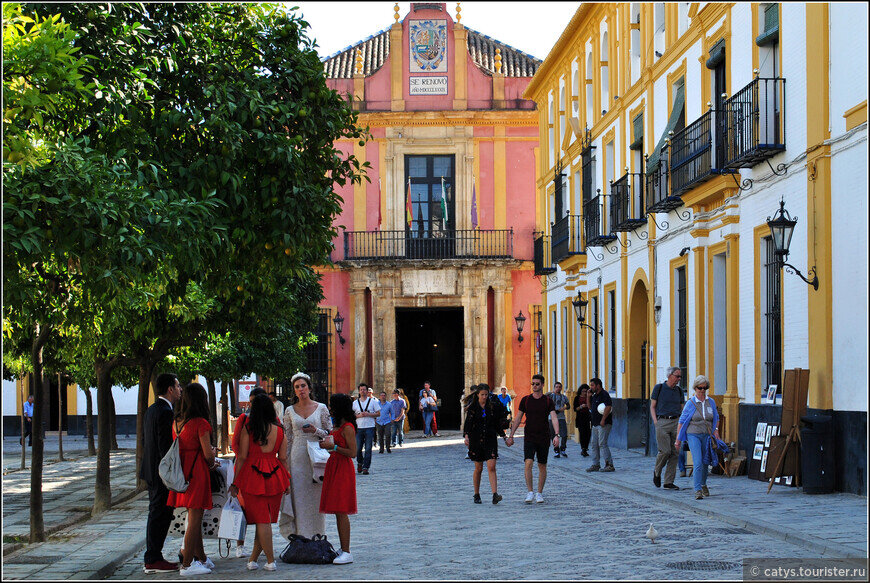 Дело в том, что тут, на замечательных и красивых Plaza del Triunfo Pzana Virgen de los Reyes, очень много лошадок. Тех самых, которые таскают туристические экипажи. Лошадки писают и какают не под ноги прохожим, слава богу, хотя казусы иногда случаются. Но устойчивый аромат давно не чищенного хлева плотно висит в нагретом солнцем воздухе, и как-то это совсем не то, что хочется ощутить после розово-апельсиновых садов Алькасара.