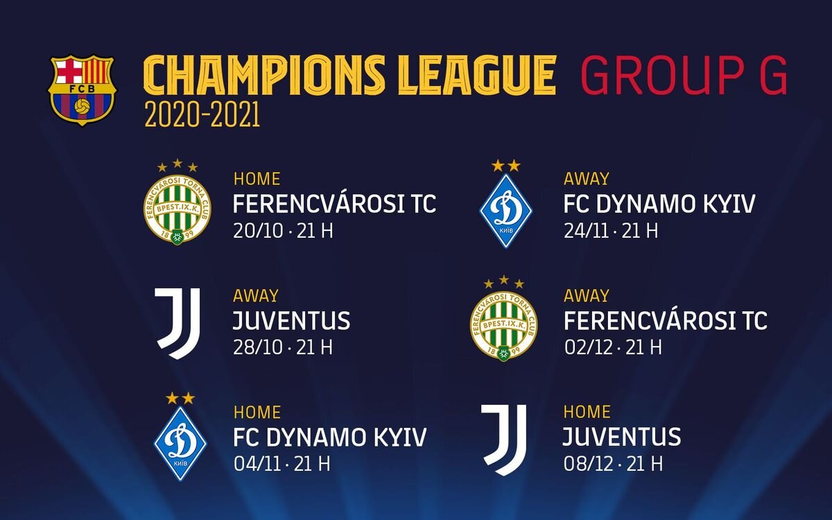 УЕФА объявила даты и время начала матчей группового этапа Лиги Чемпионов 2020/21. Барса начнет свою кампанию 20 октября с домашнего матча против венгерского Ференцвароша, а завершит групповой этап матчем на Камп Ноу против Ювентуса - 8 декабря.