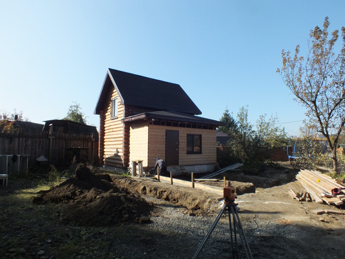 Основная коробка дома из бревна, к ней пристроена теплая веранда, наша задача сделать новый пристрой и завести под одну крышу со старым. Пристрой будет в современном стиле barn, в основе каркасная технология, поэтому в качестве фундамента, достаточно было закрутить винтовые сваи, но сделать это нам не позволил грунт, который состоит из скалы. Хозяин сам раньше работал на монтаже винтовых свай и со 100% уверенностью сказал, что их тут не закрутить на нужную нам глубину. Тогда решили, что будем заливать тумбы, но от них также отказались, потому что рядом находится септик, и грунт возле него просел, а нам нужно было ставить тумбы именно в том месте, подумали, что если хоть одна тумба пойдет вниз, то весь смысл нашего фундамента пропадет. Ничего не оставалось, как заливать ленточный фундамент. Для этого мы попробовали поискать специалистов. На объект выезжало 2 бригады. Первые предложили залит его буквой "П" и были сразу отправлены домой, вторые предложили за свои услуги ценник в 12 500 ру
