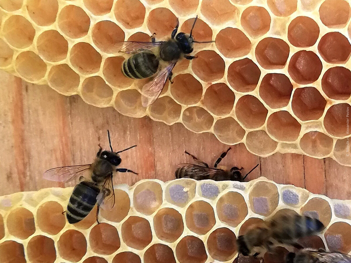 К этому моменту я рассмотрел под микроскопом уже около 10 проб различных сортов мёда купленных в магазине. Все они заметно отличались, а хотелось знать: какой же он — настоящий мёд, не разбавленный, без сахара. Найти добросовестного пасечника, который бы честно рассказал о том, как и где он добывает мёд, мне не удалось и я потерял надежду на успех, но тут свершилось самое неожиданное. Мой брат стал пчеловодом! Купил пчелиную семью, собрал в огороде улей, внутри которого были рамки с вощиной. В августе пчелы почему-то решили начать строить соты прямо на одной из стен улья. Это пчелиное сооружение, построенное из материалов, которые пчёлы выбрали сами, попало на предметный столик моего микроскопа. Посмотрим на соты из натурального пчелиного воска. Увеличение ×100. В стенках встречаются различные примеси. Иногда даже чьи-то усики или «шерсть». Дно заметно тоньше стен. Это значит, что его очень хорошо можно будет разглядеть в микроскоп. В отраженном свете прекрасно виден рельеф. А тот же с