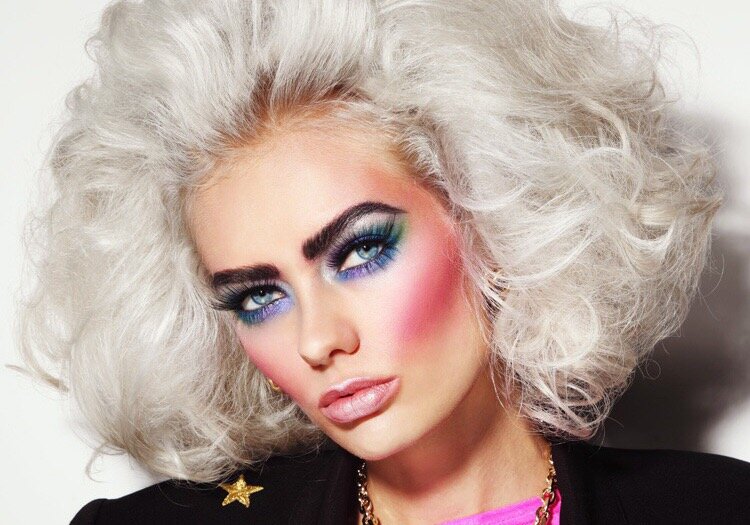 Синие и зеленые тени, брови-ниточки 70-х, потом "боевая раскраска" 80-х... 70-е годы я застала ребенком, 80е - это была моя школа, возраст уже сознательный. В те годы еще было живо наследие Советского Союза , мало руководств по декоративной косметике, еще не ушла мода восьмидесятых годов на яркий макияж. Голубые и зеленые яркие тени на веках, розовые пятна румян, наборы декоративной косметики, которые продавались на рынках-толкучках и просто с рук у всяких перекупщиков... А вот - современная имитация образа того времени, найдено в поиске. И - нет, все же не то, не то! Здесь все же сделано умеючи, плюс ретушь. А фишка 80-х была в том, что красились (по современным меркам) криво, коряво и не особо представляя, как это правильно делать. Помню - как правило, тени плохо растушевывали, подводку тоже, и вообще не пытались воспроизвести эффект натуральности. Помню пожилую даму, голубые тени у которой всегда были не на веках, а под глазами на лице: осыпались, не держались. Но из вежливости