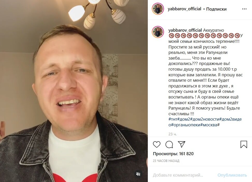 Илья Яббаров начал с того, что в социальных сетях пообещал обратиться в органы опеки и отнять у Рапунцель-младшей своего сына, а закончил грязными обвинениями в адрес матери своего ребенка. Он утверждает, что на ток-шоу Савкина приходит под запрещенными веществами, потому и мечется по студии, пытаясь на кого-нибудь напасть. В ответ на обвинения участника дома 2 Савкина заявила, что он для неё пустой звук, прочерк в графе "отец", она подает на Яббарова в суд за клевету.