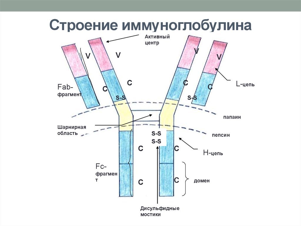 2) Строение IgG — крупные молекулы состоящие из четырёх полипептидных цепей. Одна молекула IgG содержит две идентичные тяжёлые цепи (Н-цепи) и две лёгкие цепи (L-цепи). Две тяжёлые цепи связаны друг с другом и с лёгкими связями посредством дисульфидных связей. Получающийся тетрамер состоит из двух идентичных половин, которые вместе формируют Y-образную структуру. На каждом конце «вилки» находится по одному сайту связывания с антигеном, которые имеют вариабельную структуру.