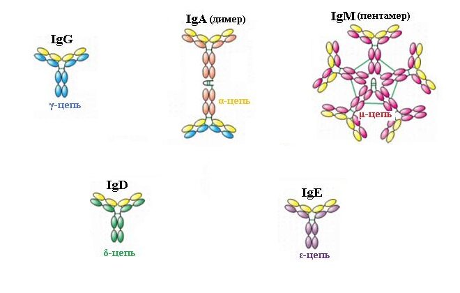 В основе этой классификации лежит в отличии друг от друга тяжелых цепей. В состав одного иммуноглобулина может входить цепь только одного вида. Существует 5 классов тяжелых цепей, а следовательно 5 классов Ig.