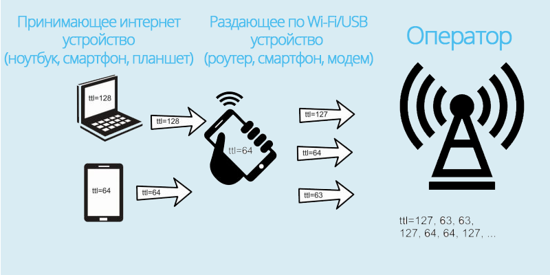 - Оператор сравнивает TTL пакетов, идущих от абонента, и видит различные значения ttl у пакетов. К примеру, от самого смартфона(модема) приходит ttl=64, от ноутбука, после прохождения через смартфон/модем — ttl=127.