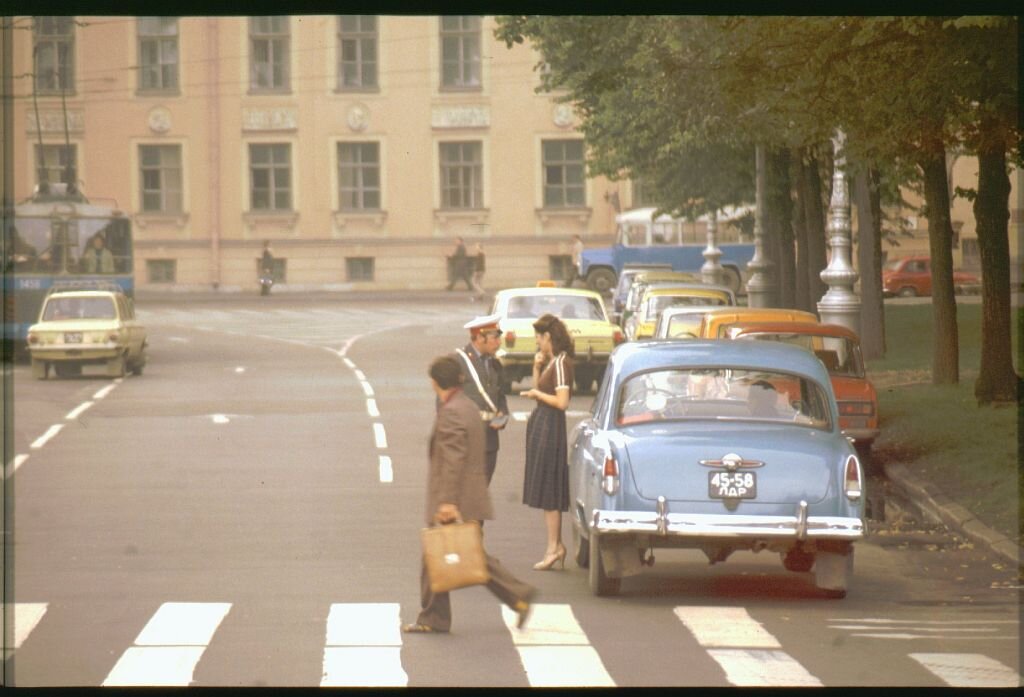 На Исаакиевской площади гаишник остановил 21-ю Волгу. А за рулём оказалась девушка - нечастое явление для тех лет.