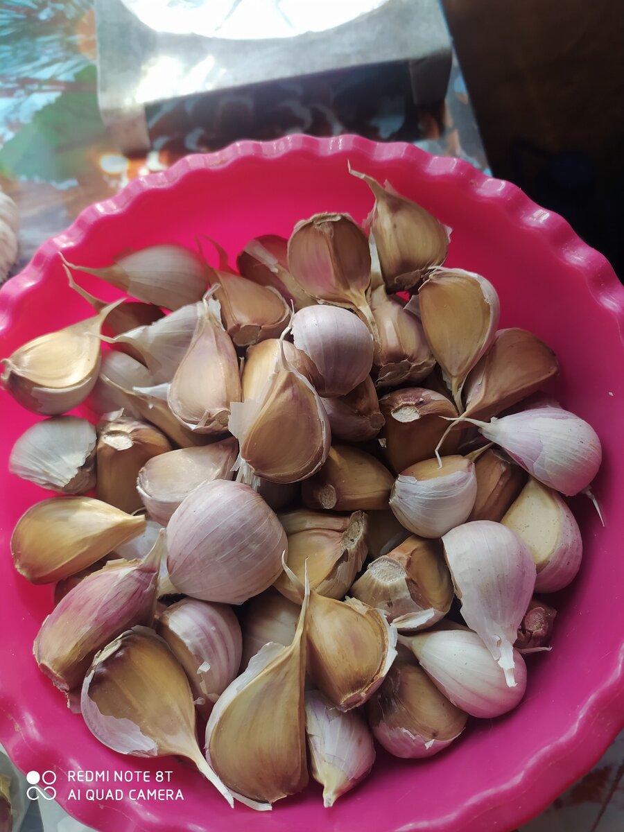 при выборе посадочного материала берутся самые крупные зубчики, не имеющие внешних повреждений, что служит гарантией крупных здоровых плодов. Необходимо отобрать только крупные, здоровые, без малейших признаков повреждения зубья, что позволит прорасти крупной чесночной луковице. Для защиты от возможного развития патогенной флоры, семена на 20-30 мин замачивают в комплексном растворе фунгицидов или жидкости со слабой концентрацией марганцовокислого калия.