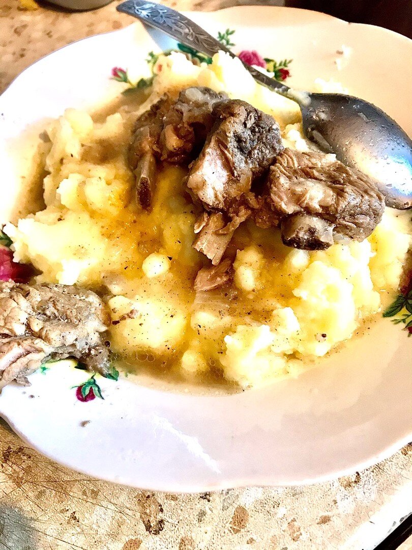 Это картофельное пюре с свиными ребрышками, еще я выпил кофе.
