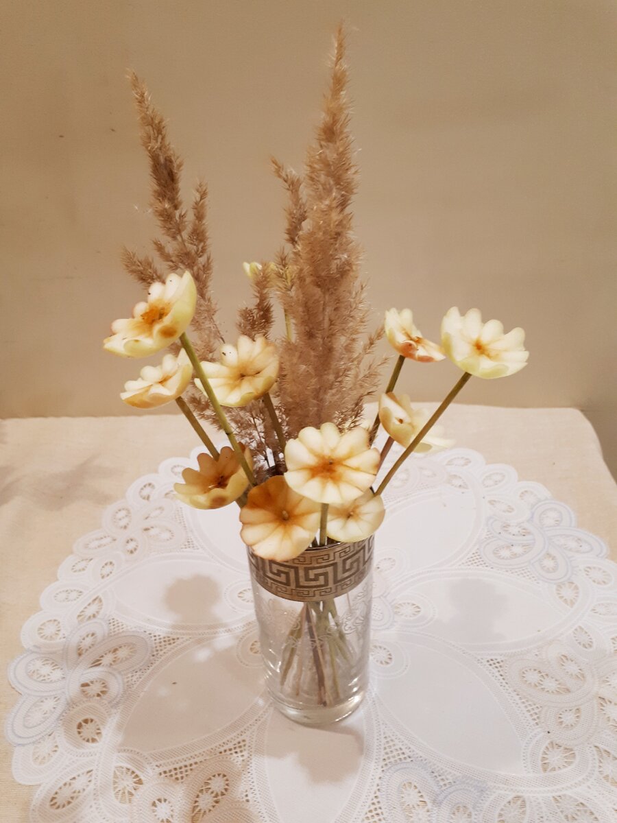 Из яблок с помощью ножа для карвинга вырезала вот такие цветы. Надела на деревянные палки и поставила в стакан, для дополнения букета добавила вот такие веточки.