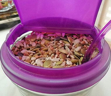 В магазинах есть штука в продаже, называется - смесь для салата, там намешано семечек и зерен всяких, но стоит это, если пересчитать состав, неоправданно дорого. Я сделала проще. Купила все по отдельности и замешательстве свой микс. Получилось очень бюджетно.