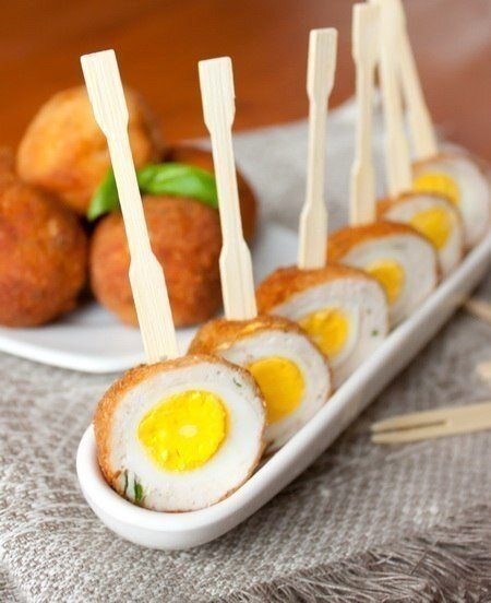 Куриный фарш делим на 12 частей. Берем в руку 1 кусочек фарша и расплющиваем в лепешку. В центр кладем перепелиное яйцо
