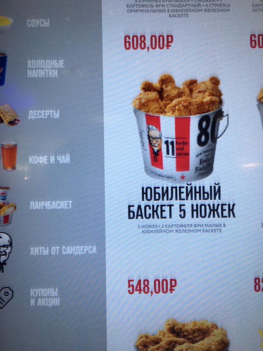 Вчера, 03.10.20, мы с семьей были в ТРК Ривьера, хотели на бонусы спасибо купить кофе в Бургере. И когда ожидали свой заказ, обратили внимание на КФС. В КФС сейчас юбилейные "скидки" в честь 80 летия там чего-то . Идет обширная реклама этого события для завлечения посетителей.