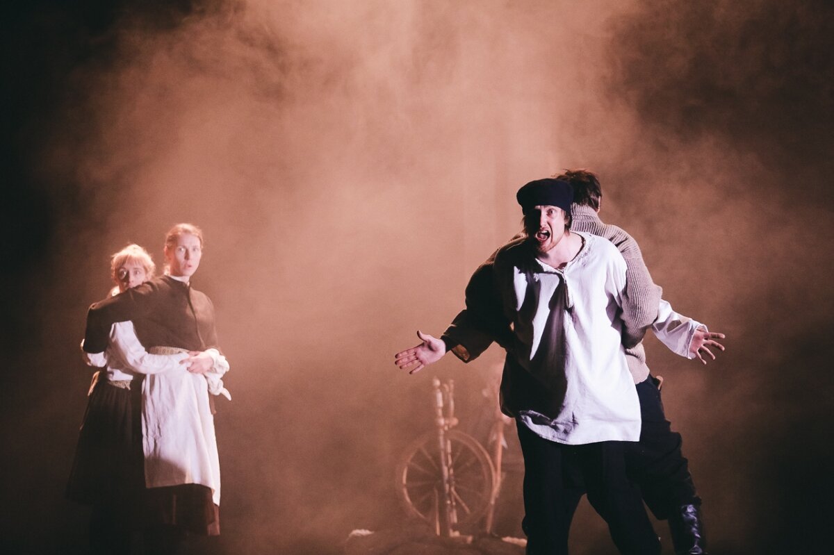 У женщин свои танцы. Игра с платками, с простынёй: то ли сами вытираются, то ли бельё стирают и встряхивают, то ли подвенечный наряд готовят — и в этом тоже много причудливой красоты. Как и в том, что вдруг неожиданно в спектакле начинают звучать… якутские мотивы. Нет, они не заполоняют спектакль — режиссер дает их маленьким штрихом. Потому и смотрят изумлённо домочадцы на Маргуса, играющего на хомусе. «Это тоже из чужого мира», — читается в глазах хозяйки и хозяина.