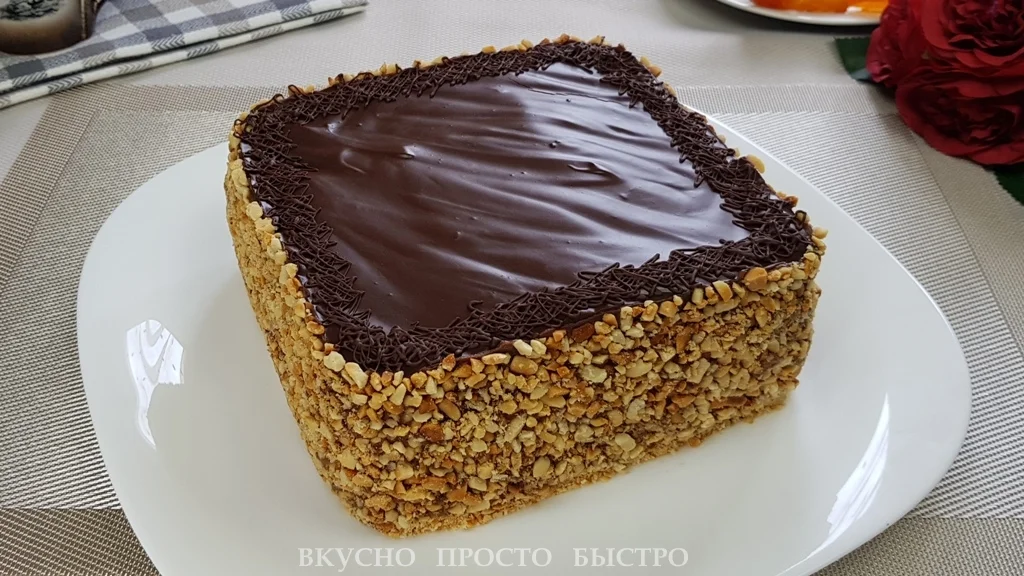 - Крем посыпаем 60 граммами измельчённого обжаренного арахиса