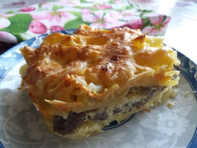 В качестве основного ингредиенты могут быть любые отварные макаронные изделия. А если и не оказалось отварных, то их можно просто отварить. А чтобы разнообразить их вкус, дополнительными ингредиентами служат мясной фарш, яйца с молоком, сыр, колбаса или вареное мясо. Уверяю, получается вкусно! А с пылу- с жару, особенно!