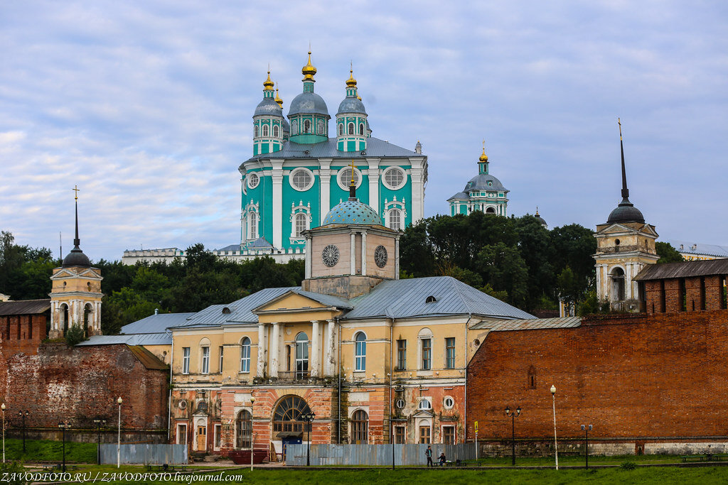Свято-Успенский кафедральный собор. Он находится на Соборной горе. Возведен в память о героической обороне Смоленска 1609-1611 годов на месте одноименного собора XII века. Успенский собор по красоте убранства занимает третье место после Нотр-Дам-Де-Пари в Париже и Собора Святого Петра в Риме. На вершину горы, ко входу в Успенский собор ведет лестница, построенная в 1767 году. Помимо основного здания собора и лестницы, в архитектурный ансамбль входят колокольни, ограды и Богоявленский собор, построенный позже основного, но выдержанный в том же стиле.