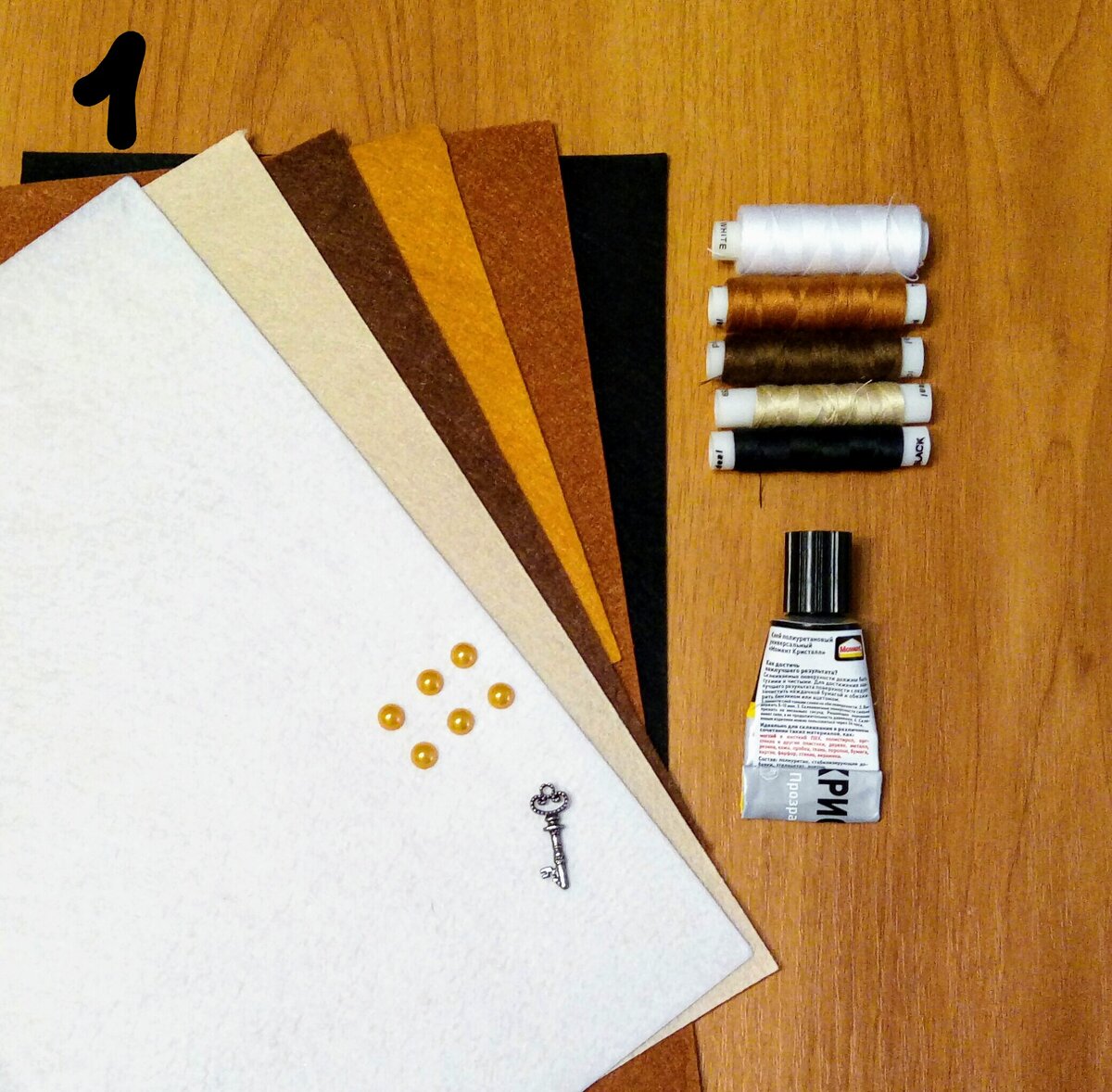 1. Для работы нам понадобятся: фетр - темно-коричневый, светло-коричневый, рыжий, белый, черный, бежевый. Нитки швейные под цвет фетра. Клей момент "Кристалл", лента липучка, ключик, шесть полубусин.