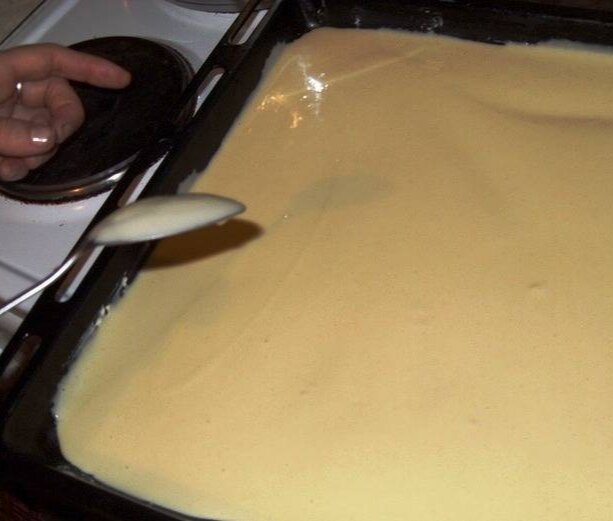 Смешиваем яйца, муку, майонез, чтобы получилось тесто. Тесто выливаем на противень или в форму для запекания.