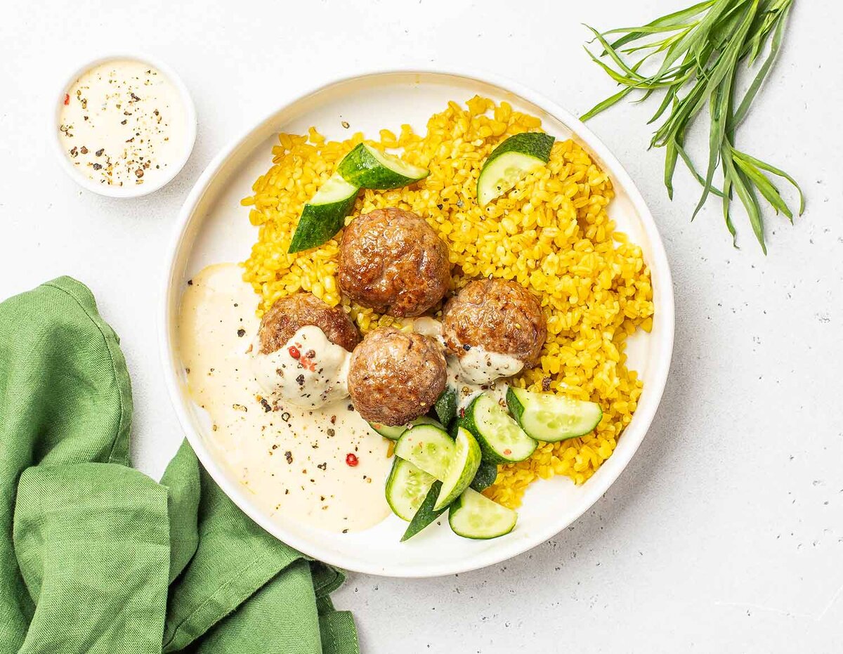 Когда 12 минут для булгура прошло, снимаем с огня и раскладываем по тарелкам. Рядом – фрикадельки. Поливаем соусом. Огурец моем, режем и едим вприкуску.⠀