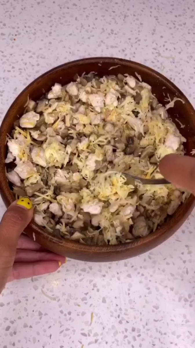 Варим куриную грудку и режем ее на кусочки, добавляем грибочки( в рифму прям🤭), добавляем тертый сыр, соль, перец, хорошенько перемешиваем .
