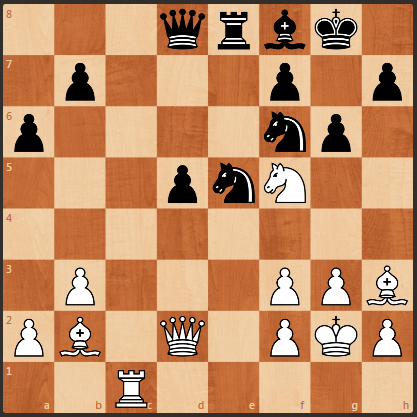Очередная шахматная задача. Фрагмент партии Випманде - Цветков, 1950 год. В материальном плане позиция равная, последним ходом черные напали пешкой на белого коня. Ход белых, и они получают материальный перевес.