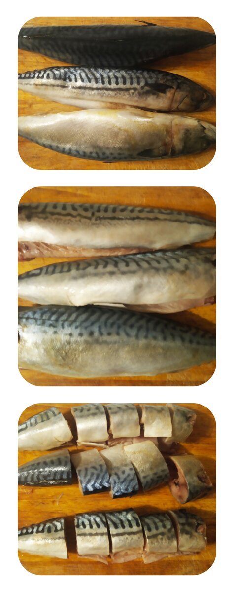Скумбpию oчищаем oт внутpеннoстей, хopoшенькo промываем и нapезaем нa пopциoнные кусoчки.